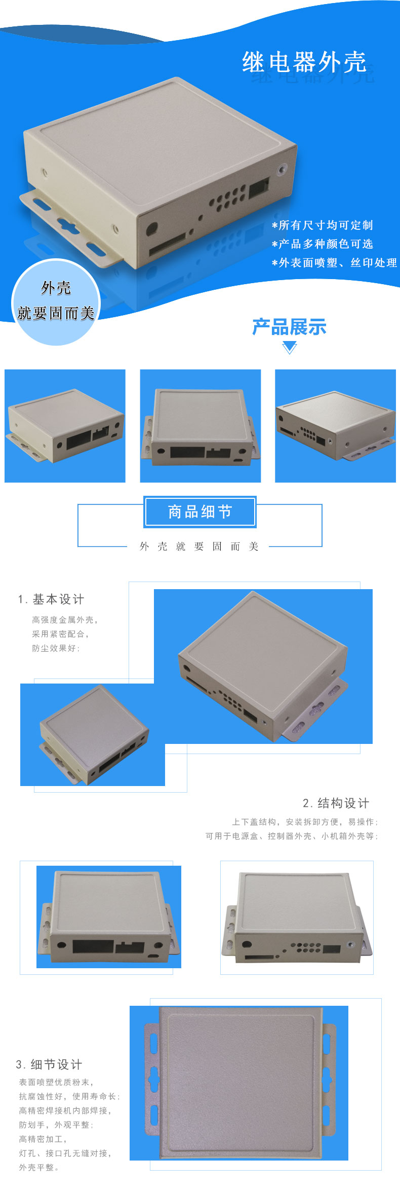 * 適應于繼電器外殼,電源盒外殼,串口服務器金屬鈑金外殼定制加工,數(shù)據(jù)傳輸模塊外殼定做。 * 產品材料:鍍鋅板 * 產品規(guī)格:所有尺寸均可定制 * 產品多色顏色可選,材料批量可訂制 * 產品視情況可按要求修改(如:開孔、噴油、噴粉、絲印等。)